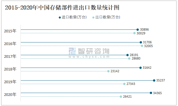 2015-2020年中國存儲部件進出口數量統計圖