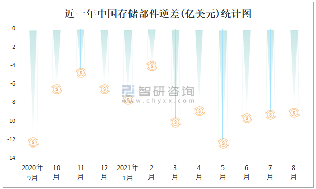 近一年中國存儲部件逆差(億美元)統計圖