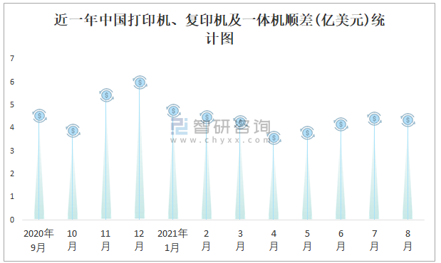 近一年中國打印機、復印機及一體機順差(億美元)統計圖