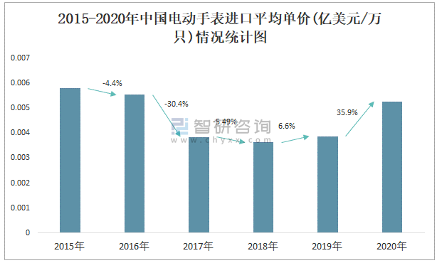 2015-2020年中國電動手表進口平均單價(億美元/萬只)情況統計圖