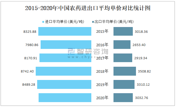 2015-2020年中國農藥進出口平均單價對比統計圖