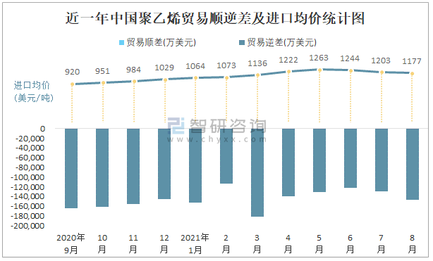近一年中國聚乙烯順逆差及進(jìn)口均價(jià)統(tǒng)計(jì)圖