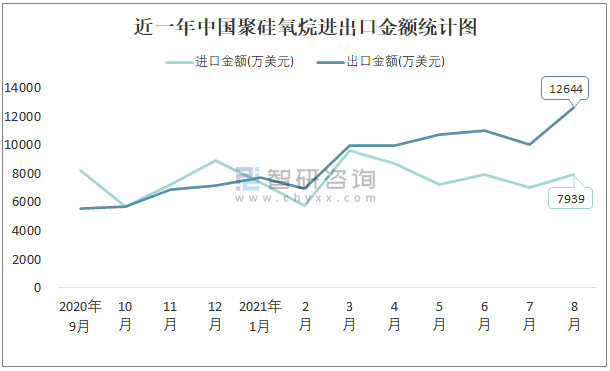 根據(jù)中國石油和化學(xué)工業(yè)聯(lián)合會數(shù)據(jù)顯示:2021年8月中國聚硅氧烷進(jìn)口數(shù)量為1.1萬噸,出口數(shù)量為3.4萬噸;進(jìn)口金額為7939萬美元,出口金額為12644萬美元;近一年中國聚硅氧烷出口總金額大于進(jìn)口總金額,貿(mào)易順差為主,8月出口均價3719美元/噸。