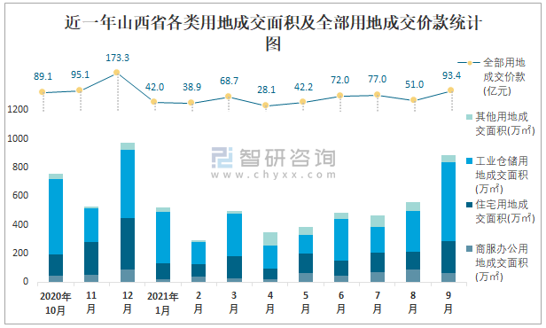 近一年山西省各類(lèi)用地成交面積及全部用地成交價(jià)款統(tǒng)計(jì)圖