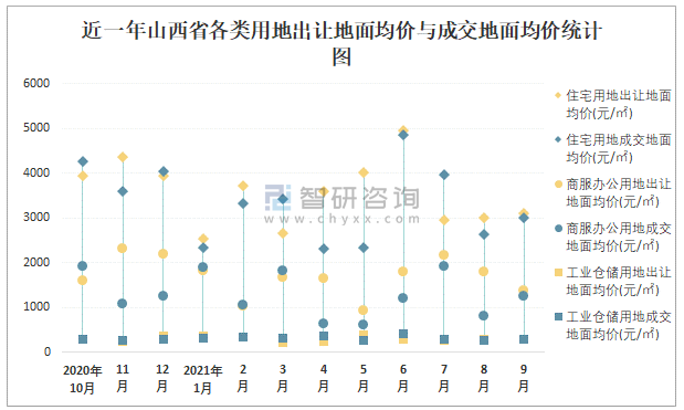 近一年山西省各類(lèi)用地出讓地面均價(jià)與成交地面均價(jià)統(tǒng)計(jì)圖