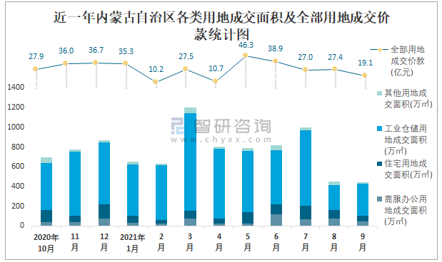 近一年內蒙古自治區各類用地成交面積及全部用地成交價款統計圖