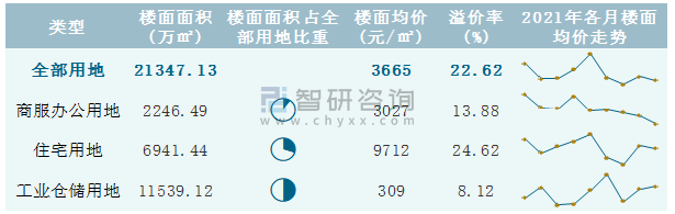 根據(jù)國(guó)信房地產(chǎn)信息網(wǎng)數(shù)據(jù)統(tǒng)計(jì)可知:2021年9月浙江省全部用地出讓地面均價(jià)為9853元/㎡,其中住宅用地出讓地面均價(jià)最高(22998元/㎡),全部用地成交地面均價(jià)為4549元/㎡,其中住宅用地成交地面均價(jià)為18394元/㎡,高于商服辦公用地成交地面均價(jià);2021年1-9月浙江省工業(yè)倉(cāng)儲(chǔ)用地樓面面積占其全部用地比重最多,為54.05%,溢價(jià)率為8.12%。