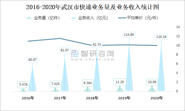 2016-2020年武漢市快遞業務量及業務收入統計圖