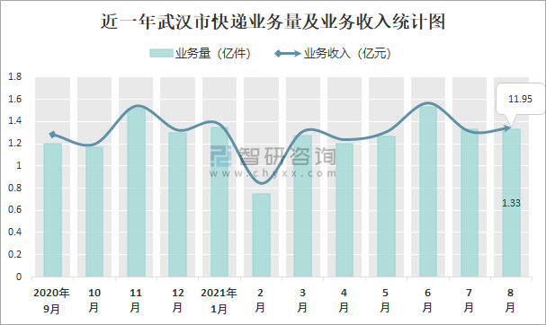 根據各省市郵政局數據可知:2021年8月武漢市快遞業務量占湖北快遞業務量的59.58%,湖北快遞業務量占全國快遞業務量的2.55%;2021年8月武漢市快遞業務收入占湖北快遞業務收入的60.82%,湖北快遞業務收入占全國快遞業務收入的2.39%。