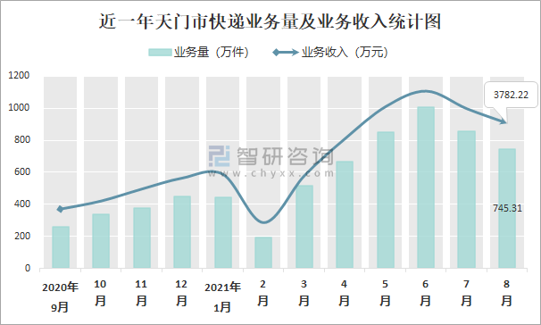 近一年天門市快遞業(yè)務(wù)量及業(yè)務(wù)收入統(tǒng)計圖