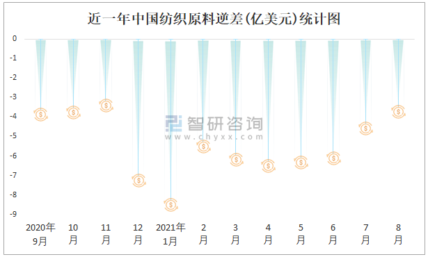 近一年中國(guó)紡織原料逆差(億美元)統(tǒng)計(jì)圖