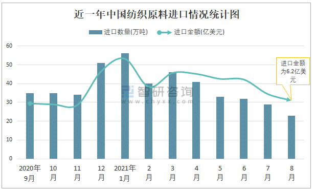 近一年中國(guó)紡織原料進(jìn)口情況統(tǒng)計(jì)圖