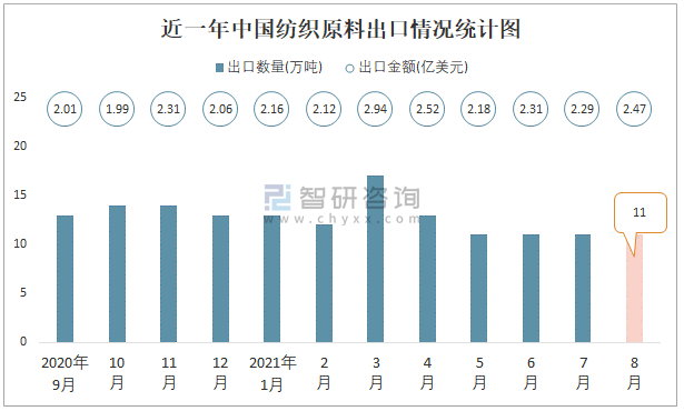 近一年中國(guó)紡織原料出口情況統(tǒng)計(jì)圖