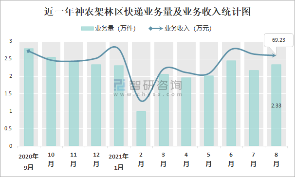 2021年8月神農架林區快遞業務量與業務收入分別為2.33萬件和69.23萬元