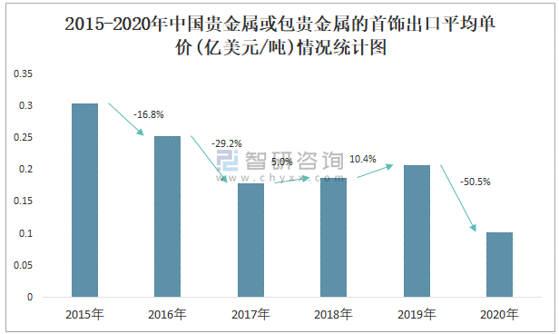 2015-2020年中國貴金屬或包貴金屬的首飾出口平均單價(億美元/噸)情況統計圖