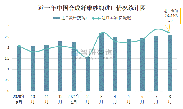 根據中國海關數據顯示:2021年8月中國合成纖維紗線進口數量為2.59萬噸,同比增長35.5%,進口金額為1.44億美元,同比增長46.5%,2021年1-8月中國合成纖維紗線進口數量為19.04萬噸,進口金額為10.01億美元。