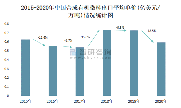 2015-2020年中國(guó)合成有機(jī)染料出口平均單價(jià)(億美元/萬(wàn)噸)情況統(tǒng)計(jì)圖