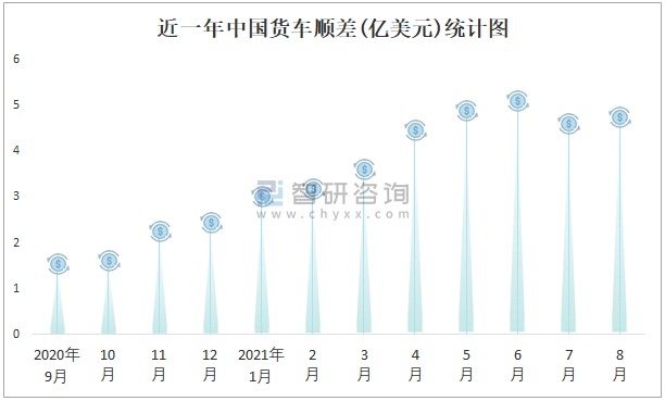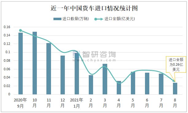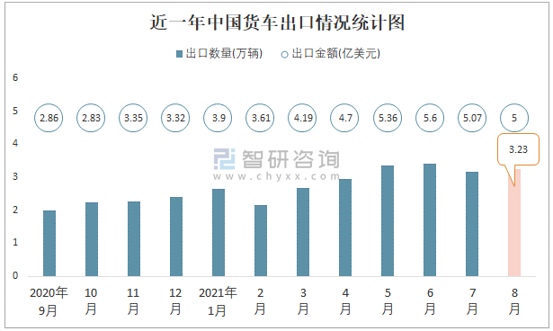 根據中國海關數據顯示:2021年8月中國貨車進口數量為0.03萬輛,同比下降77.8%,進口金額為0.26億美元,同比下降79.6%,2021年8月中國貨車出口數量為3.23萬輛,同比增長115.7%,出口金額為5億美元,同比增長135.4%;2021年1-8月中國貨車進口數量為0.43萬輛,進口金額為3.82億美元,出口數量為23.55萬輛,出口金額為37.41億美元。