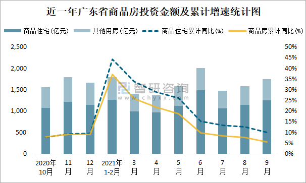 近一年廣東省商品房投資金額及累計增速統計圖