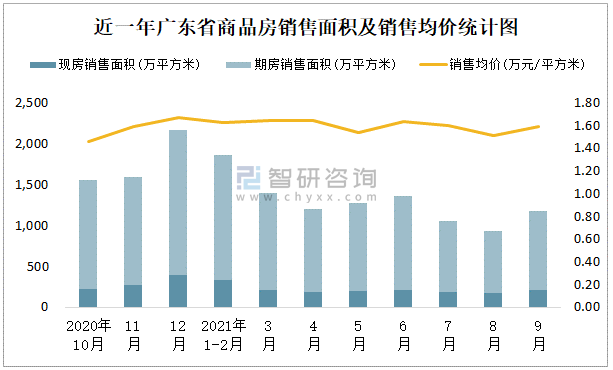 近一年廣東省商品房銷售面積及銷售均價統計圖