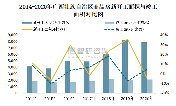 2014-2020年廣西壯族自治區(qū)商品房新開(kāi)工面積與竣工面積對(duì)比圖