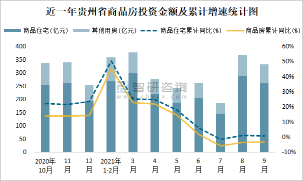 近一年貴州省商品房投資金額及累計增速統(tǒng)計圖