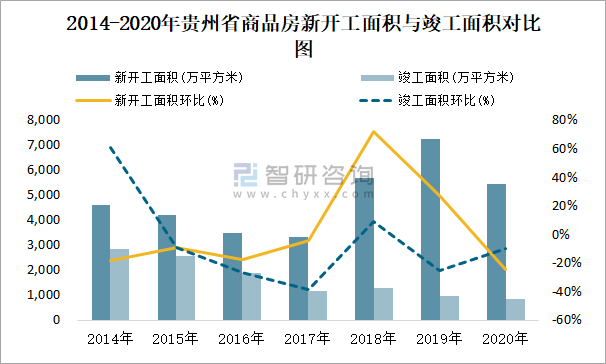 2014-2020年貴州省商品房新開工面積與竣工面積對比圖
