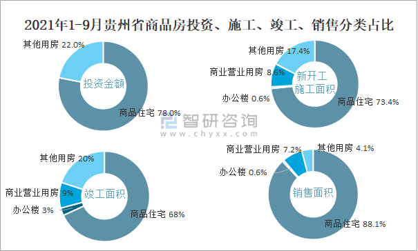 2021年1-9月貴州省商品房投資、施工、竣工、銷售分類占比