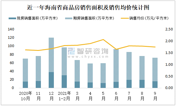 根據國家統計局數據統計可知:2021年9月海南省商品房銷售面積為72.29萬平方米(其中銷售現房15.7萬平方米,期房56.59萬平方米),銷售額為126.35億元,銷售均價約為1.75萬元/平方米;2021年1-9月海南省商品房累計銷售面積為607.49萬平方米,銷售面積累計同比增長25.1%,累計銷售額為1096.2億元,銷售額累計同比增長37.4%;2014-2020年海南省商品房總銷售面積2017年達到最高值,此后有所下滑,其中期房銷售面積大大高于現房銷售面積,銷售均價逐年遞增。