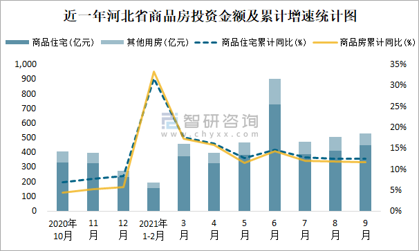 根據國家統計局數據統計可知:2021年9月河北省房地產開發投資商品房投資金額為530.48億元(其中商品住宅為449.62億元,辦公樓、商業營業用房等其他用房80.86億元);2021年1-9月河北省房地產開發投資商品房累計投資金額為3934.04億元,投資金額累計同比增長11.7%。
