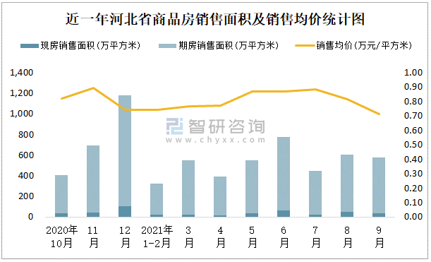 近一年河北省商品房銷售面積及銷售均價統計圖