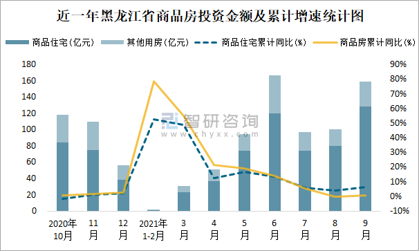 根據國家統計局數據統計可知:2021年9月黑龍江省房地產開發投資商品房投資金額為159.26億元(其中商品住宅為128.34億元,辦公樓、商業營業用房等其他用房30.92億元);2021年1-9月黑龍江省房地產開發投資商品房累計投資金額為702.91億元,投資金額累計同比增長0.7%。