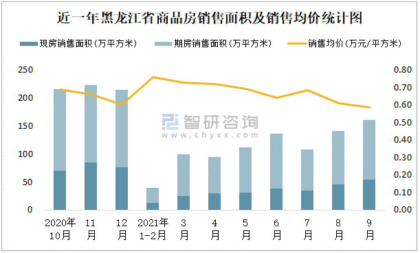 根據國家統計局數據統計可知:2021年9月黑龍江省商品房銷售面積為160.63萬平方米(其中銷售現房53.82萬平方米,期房106.81萬平方米),銷售額為94.36億元,銷售均價約為0.59萬元/平方米;2021年1-9月黑龍江省商品房累計銷售面積為889.94萬平方米,銷售面積累計同比增長5.8%,累計銷售額為587.66億元,銷售額累計同比下降8.1%;2014-2020年黑龍江省商品房總銷售面積2014年達到最高值,此后有所下滑,其中期房銷售面積大大高于現房銷售面積,銷售均價2019年達到最高值,此后有所下滑。