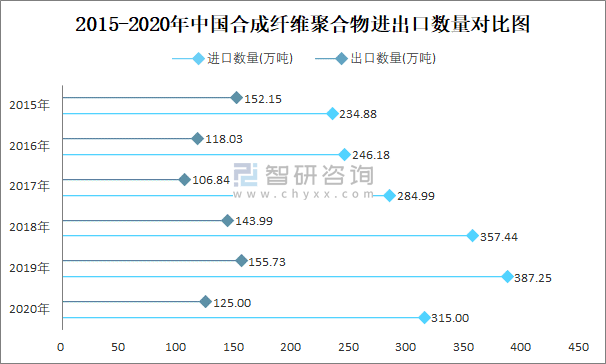 2015-2020年中國合成纖維聚合物進出口數量對比統計圖