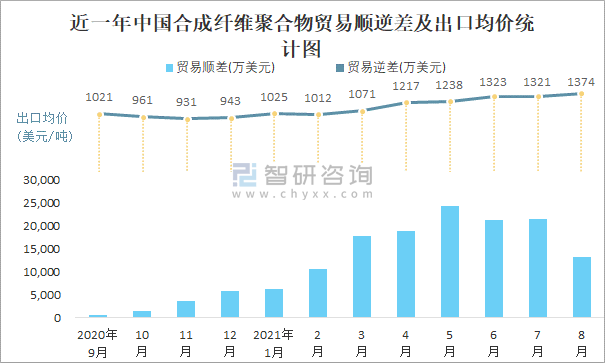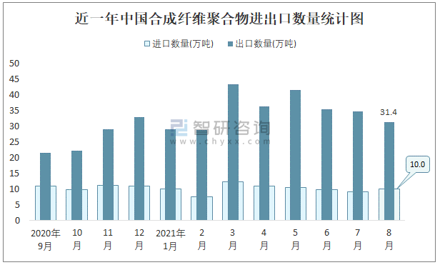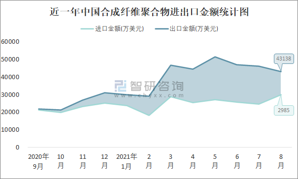 根據中國石油和化學工業聯合會數據顯示:2021年8月中國合成纖維聚合物進口數量為10萬噸,出口數量為31.4萬噸;進口金額為29853萬美元,出口金額為43138萬美元;近一年中國合成纖維聚合物出口總金額大于進口總金額,貿易順差為主,8月出口均價1374美元/噸。