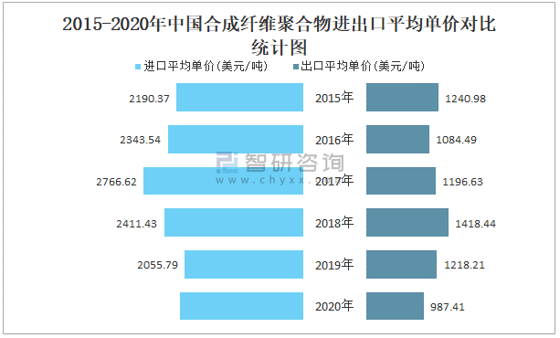 2015-2020年中國合成纖維聚合物進出口平均單價對比統計圖