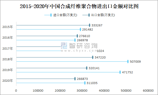 2015-2020年中國合成纖維聚合物進出口金額對比統計圖