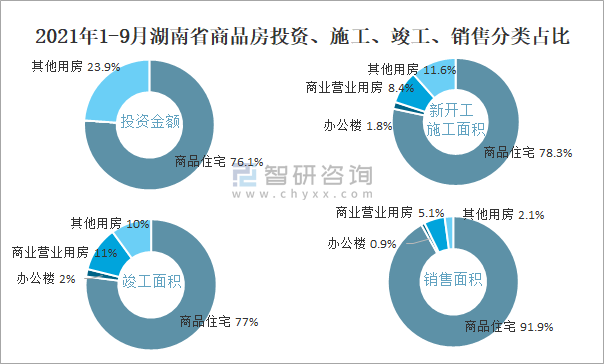 2021年1-9月湖南省商品房投資、施工、竣工、銷售分類占比