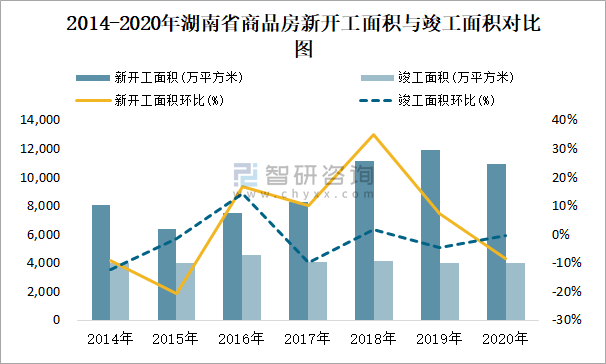 2014-2020年湖南省商品房新開工面積與竣工面積對比圖