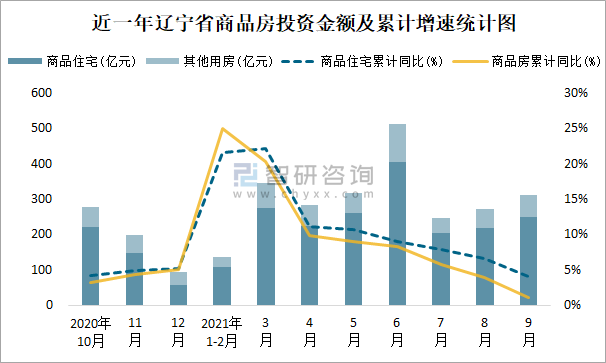 近一年遼寧省商品房投資金額及累計(jì)增速統(tǒng)計(jì)圖