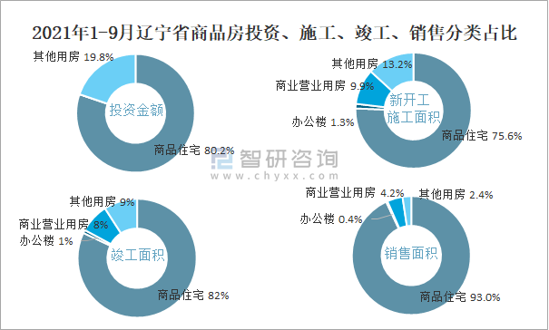 2021年1-9月遼寧省商品房投資、施工、竣工、銷售分類占比