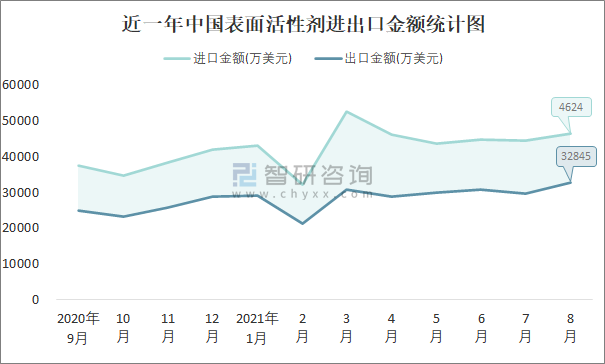近一年中國(guó)表面活性劑進(jìn)出口金額統(tǒng)計(jì)圖