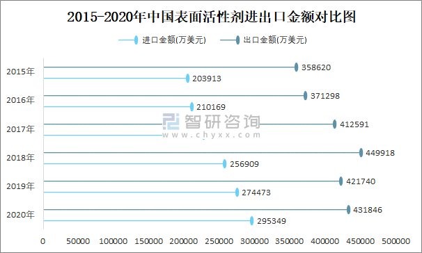 2015-2020年中國(guó)表面活性劑進(jìn)出口金額對(duì)比統(tǒng)計(jì)圖