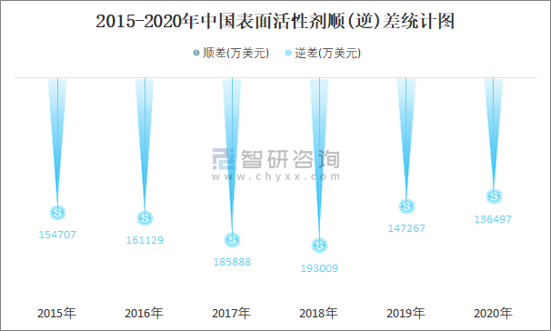 2015-2020年中國(guó)表面活性劑順(逆)差統(tǒng)計(jì)圖