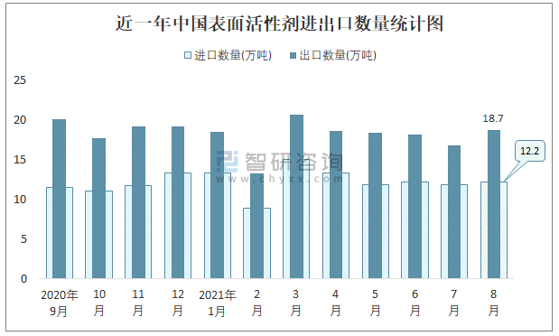 近一年中國(guó)表面活性劑進(jìn)出口數(shù)量統(tǒng)計(jì)圖