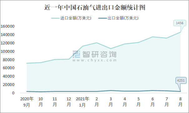 根據中國石油和化學工業聯合會數據顯示:2021年8月中國石油氣進口數量為215.2萬噸,出口數量為5.9萬噸;進口金額為145661萬美元,出口金額為4251萬美元;近一年中國石油氣出口總金額小于進口總金額,貿易逆差為主,8月進口均價677美元/噸。
