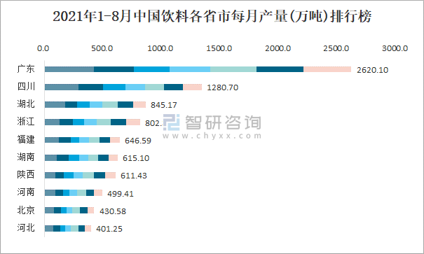2021年1-8月中國飲料各省市每月產量排行榜