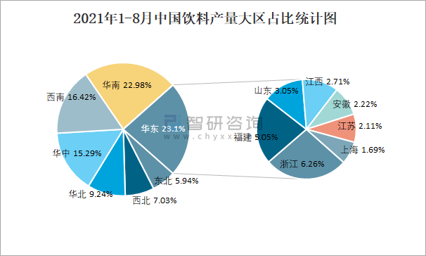2021年1-8月中國飲料產量大區占比統計圖