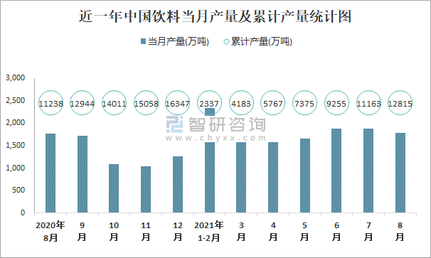 根據國家統計局數據顯示:2021年8月中國飲料產量為1791萬噸,同比增長1.7%;2021年1-8月中國飲料累計產量為12815.1萬噸,累計增長14.3%;2015-2020年中國飲料產量2018年跌至最低,此后總體呈現上升趨勢。