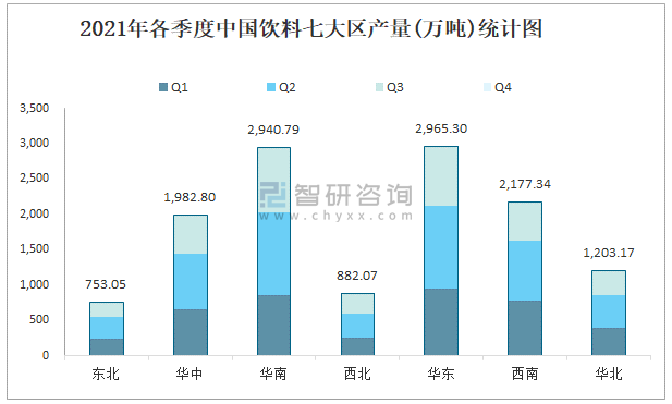 2021年各季度中國飲料七大區產量統計圖